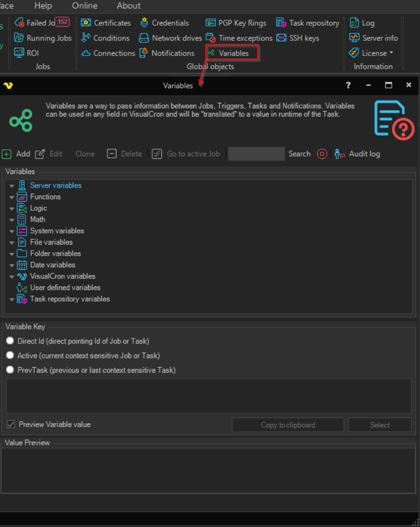 When clicking on a variable, VisualCron will try to obtain the value of the variable in real time. This value will be shown in the yellow Value Preview text box.