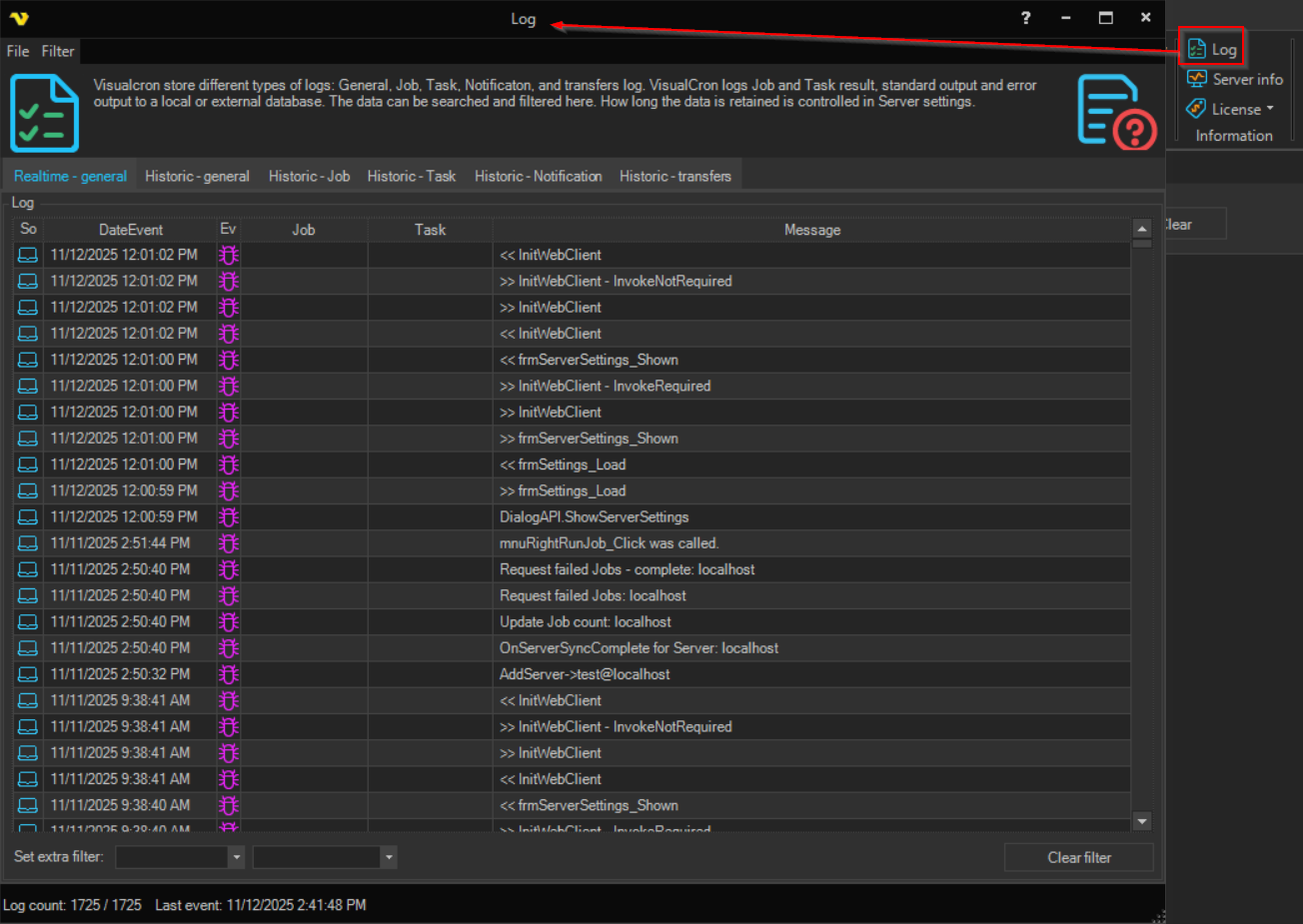 In the main menu Server > Information > Log you can list events from the client and the server without saving and reading a log text file. By default, the server is sending all log events to the client. All the log window settings are controlled from the main menu Server > Settings > Log settings dialog.