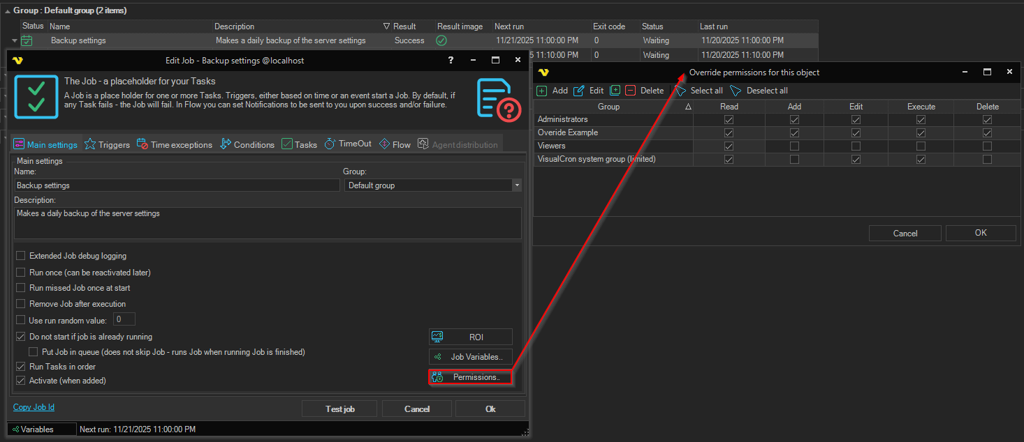 From VisualCron version 6.1.2, permissions for a specific Job can be set. It is controlled by overriding the current existing groups. When a specific permission is overridden in a positive way (granting access) it becomes green in the grid and it becomes red if overridden in a negative way (denying access).