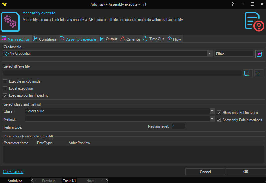 The Process - Assembly execute Task lets you specify a .NET .exe or .dll file and execute methods within that assembly. Select an assembly, class and method. Then double click on parameter rows to set values. Depending on the value type different input forms will be used.