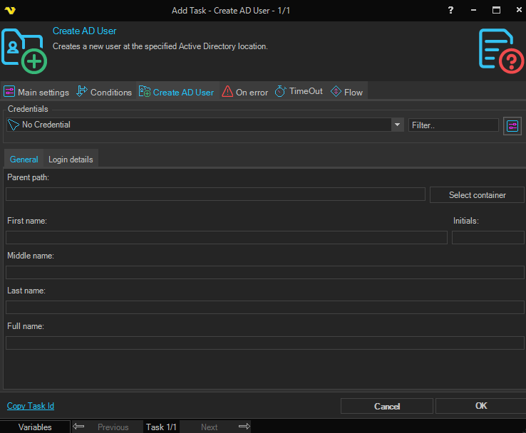 The Pre-Windows 2000 logon name of the Active Directory user to be created. This defaults to the data entered in the User Logon Name property minus the @domain parameter (if applicable).