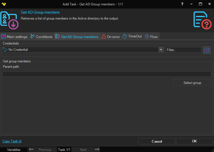 The Lightweight Directory Access Protocol (LDAP) path of the parent Active Directory container. This is usually the top most container or the root of the directory data tree on a directory server. Click the Select group button to select an existing Active Directory group.