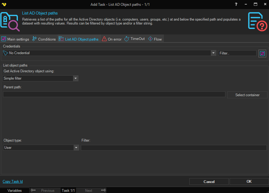 Retrieves a list of the paths for all the Active Directory objects (i.e.computers, users, groups, etc.) at and below the specified path and populates a data set with resulting values. Results can be filtered by object type and/or a filter string.