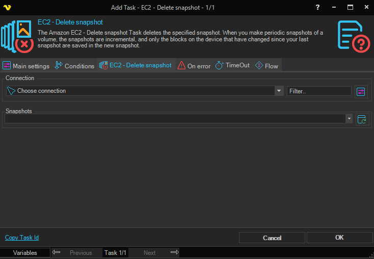The Amazon EC2 - Delete snapshot Task deletes the specified snapshot. When you make periodic snapshots of a volume, the snapshots are incremental and only the blocks on the device that have been changed since your last snapshot are saved in the new snapshot.