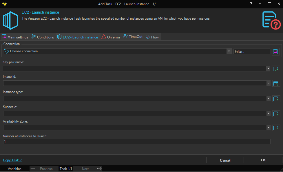 The Amazon EC2 - Launch instance Task launches the specified number of instances using an AMI for which you have permissions.
