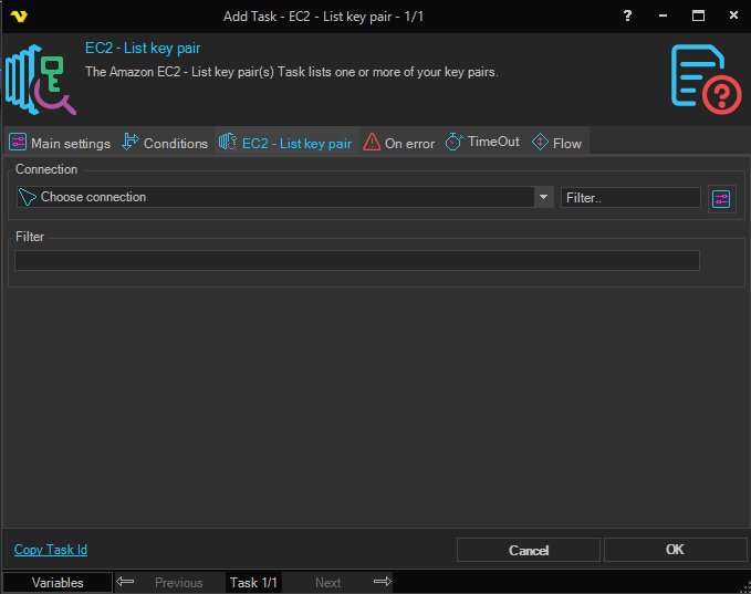 To use Amazon EC2 Tasks you need to create a Connection first. Click the Settings icon to open the Manage Connections dialog.