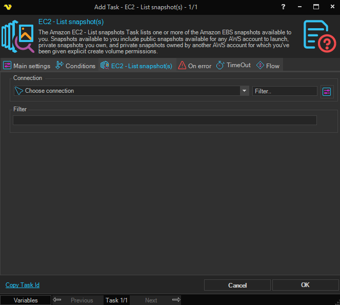 The Amazon EC2 - List snapshots Task lists one or more of the Amazon EBS snapshots available to you. Snapshots available to you include public snapshots available for any AWS account to launch, private snapshots you own and private snapshots owned by another AWS account for which you've been given explicit create volume permissions.