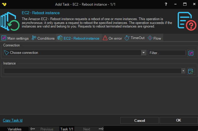 To use Amazon EC2 Tasks you need to create a Connection first. Click the Settings icon to open the Manage Connections dialog.