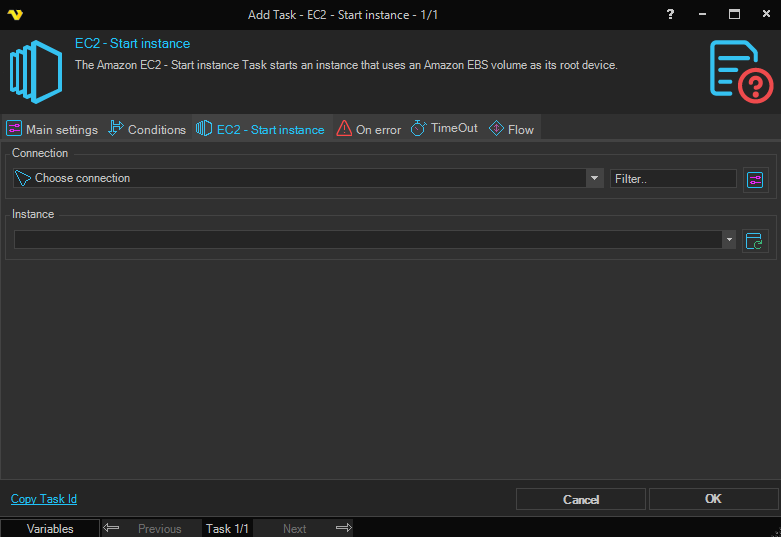 The Amazon EC2 - Start instance Task starts instance that uses an Amazon EBS volume as its root device.