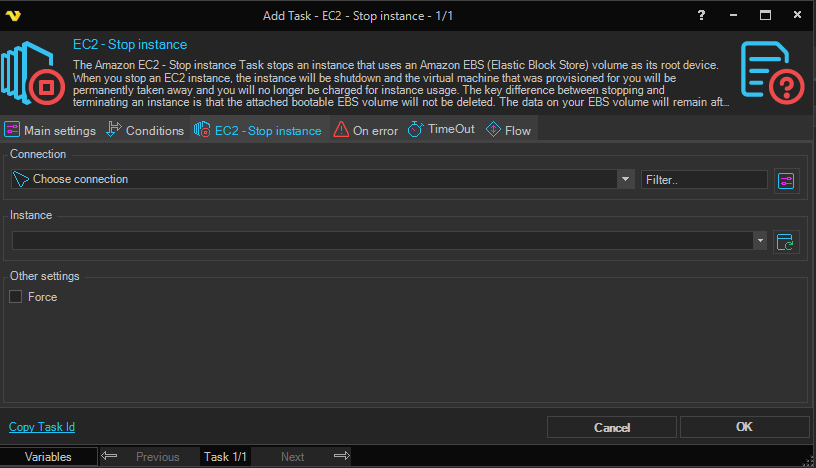 The Amazon EC2 - Stop instance Task stops an instance that uses an Amazon EBS (Elastic Block Store) volume as its root device. When you stop an EC2 instance, the instance will be shutdown and the virtual machine that was provisioned for you will be permanently taken away and you will no longer be charged for the instance usage. The key difference between stopping and terminating an instance is that the attached bootable EBS volume will not be deleted. The data on your EBS volume will remain after stopping while all information on the local (ephemeral) hard drive will be lost as usual.