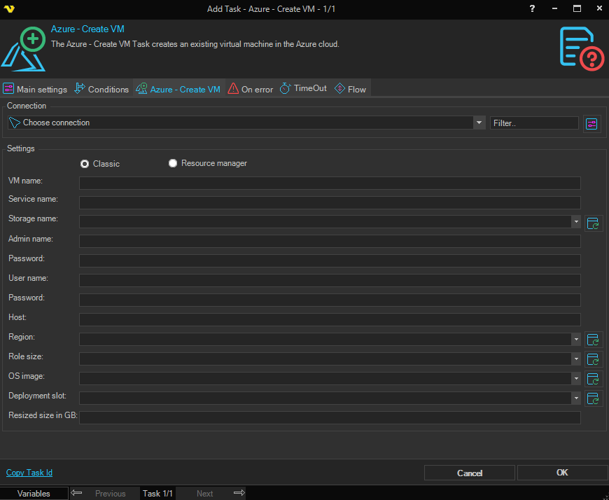 The Azure - Create VM Task creates an existing virtual machine in the Azure cloud.