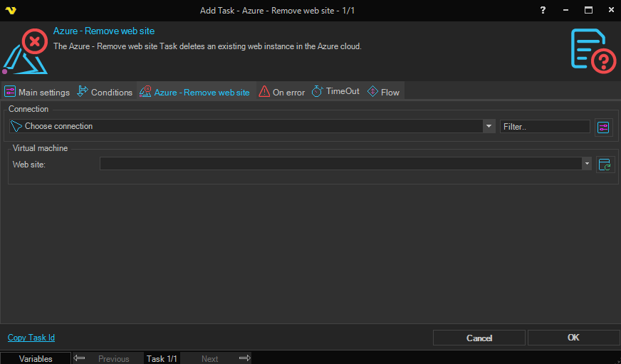 The Azure - Restart Web Site Task deletes an existing web instance in the Azure cloud. This Task is using the Microsoft Azure Connection.