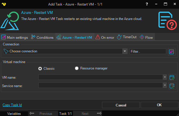 The Azure - Restart VM Task restarts an existing virtual machine in the Azure cloud. This Task is using the Microsoft Azure Connection.