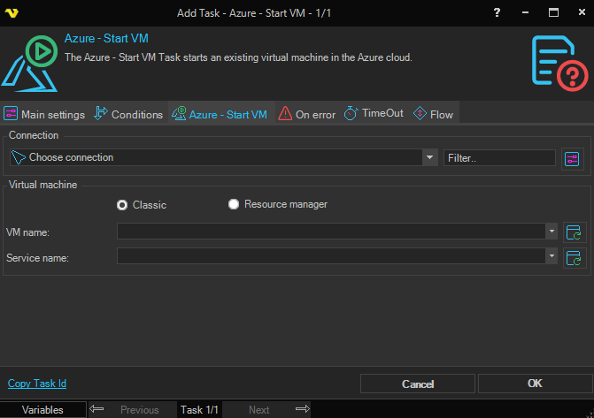 The Azure - Start VM Task starts an existing virtual machine in the Azure cloud. This Task is using the Microsoft Azure Connection.