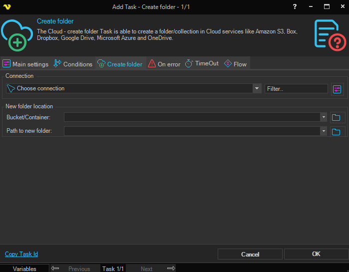 The Cloud - Create folder Task is able to create a folder with Cloud services like Amazon S3, Box, Dropbox, Google Drive, Microsoft Azure and OneDrive.