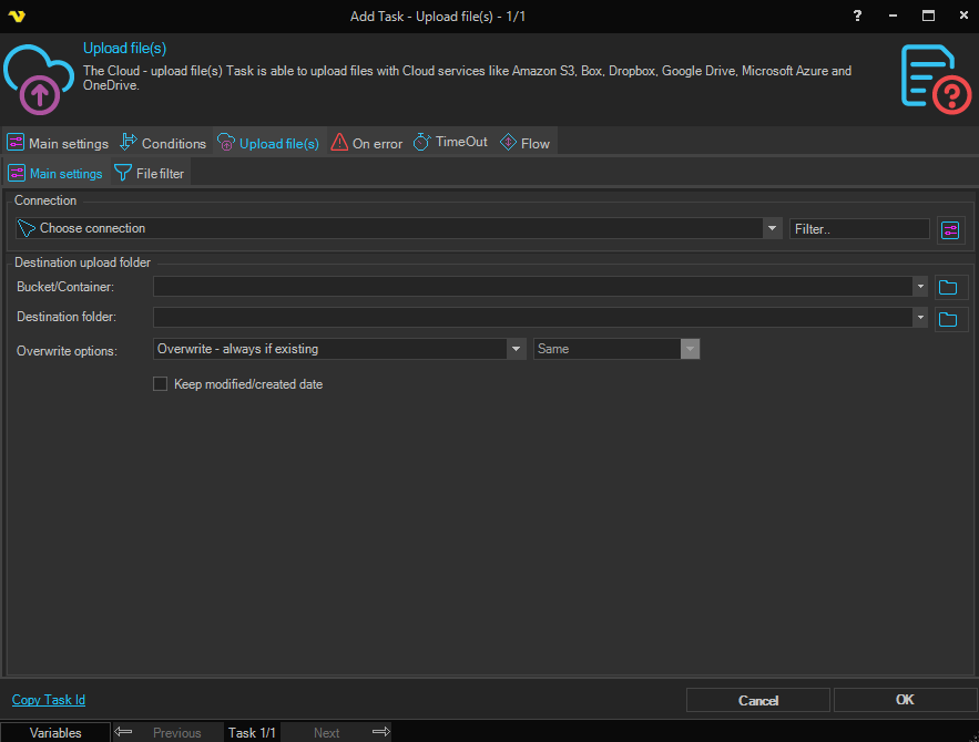 The Cloud - Upload file(s) Task let's you upload files to a cloud service like Amazon S3, Box, Dropbox, Google Drive, Microsoft Azure and OneDrive.