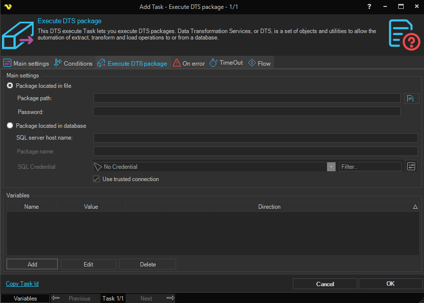 This Task lets you execute local DTS packages. VisualCron must reside on the server machine to be able to execute this Task. To execute remote DTS packages you can use the SQL Task and type Job.