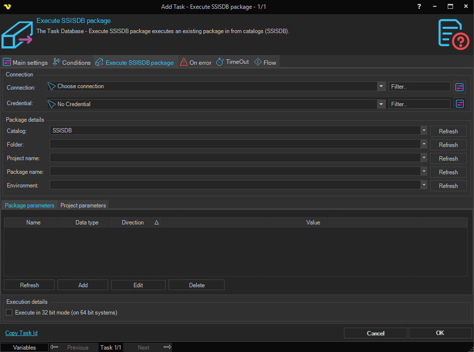 The Task Database - Execute SSISDB package executes an existing package in from catalogs (SSISDB).