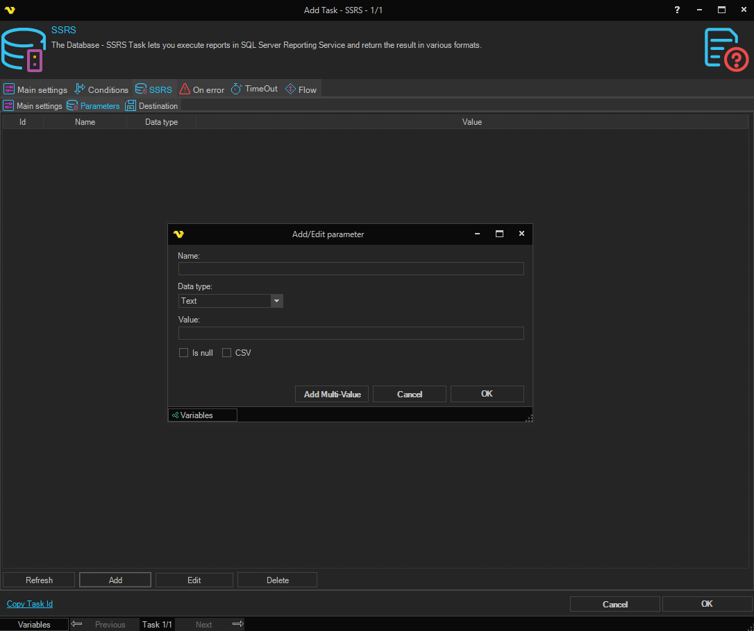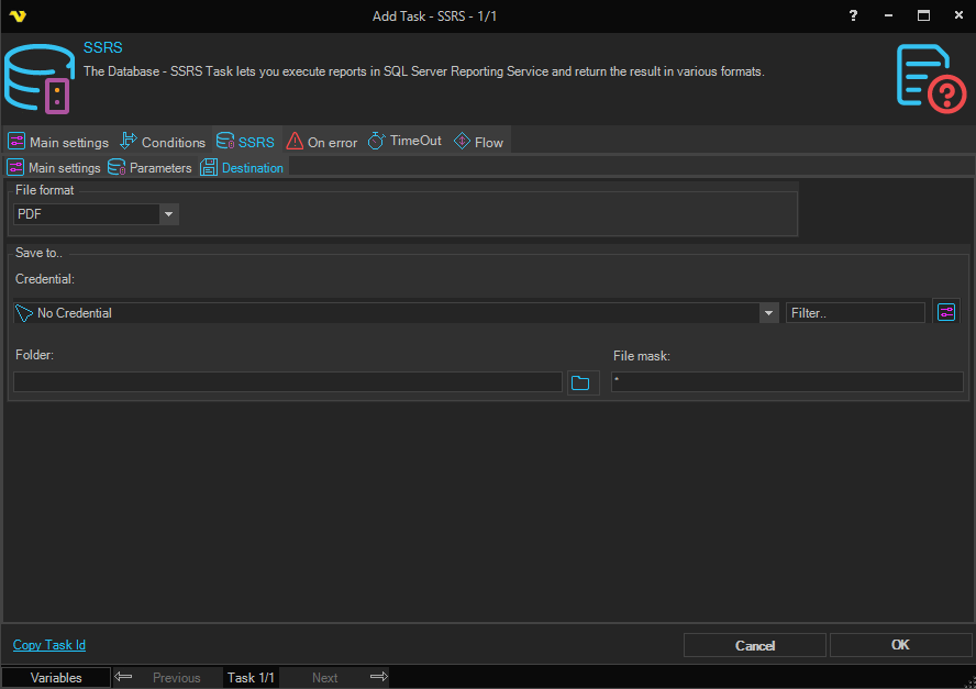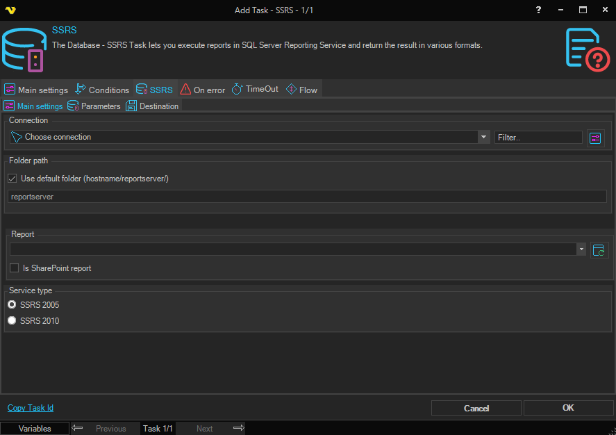 This Task type uses the global SSRS Connection type. Define username, password, host name and proxy in the Connection.