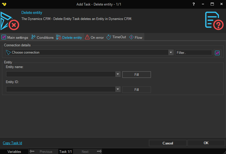 The Dynamics CRM - Delete Entity Task deletes an Entity in Dynamics CRM instance.