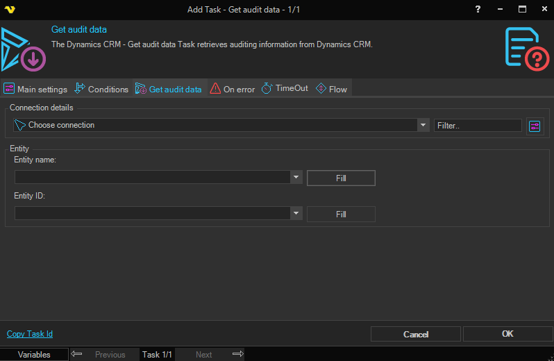 The Dynamics CRM - Get audit data Task retrieves auditing information from Dynamics CRM instance.