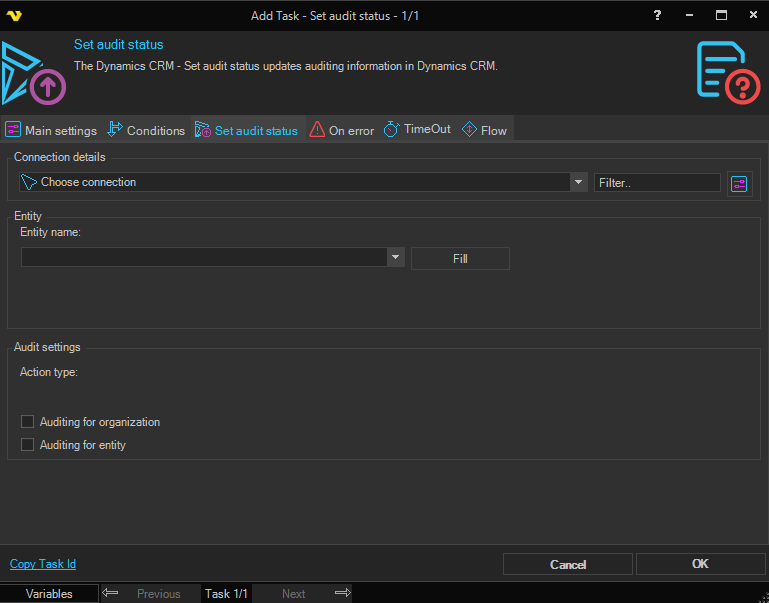 The Dynamics CRM - Set audit data Task changes auditing status on a specific Entity in a Dynamics CRM instance.
