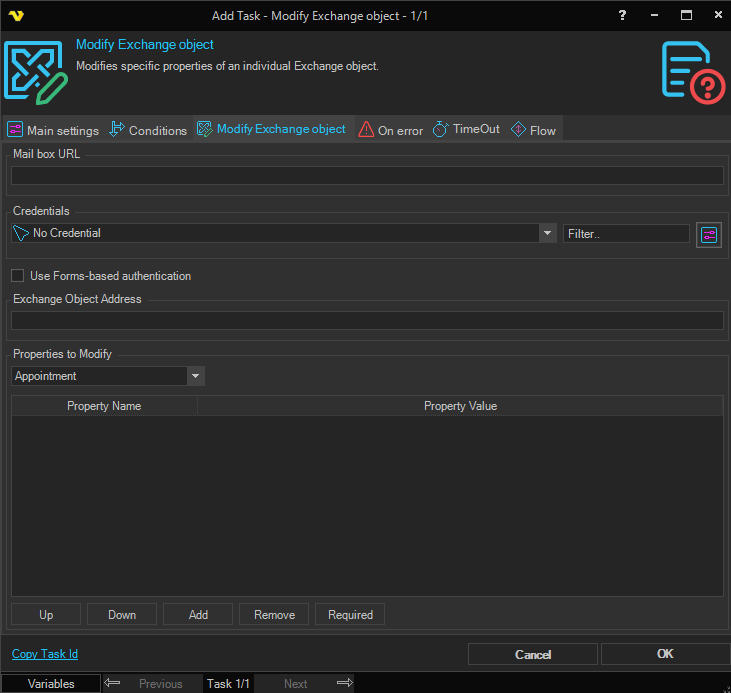 Select the appropriate Exchange object in the list: Appointment, Contact or Task. Press the Add button to add a property to be defined. In the list of defined objects, mark and select: Remove, Move up and Move Down.