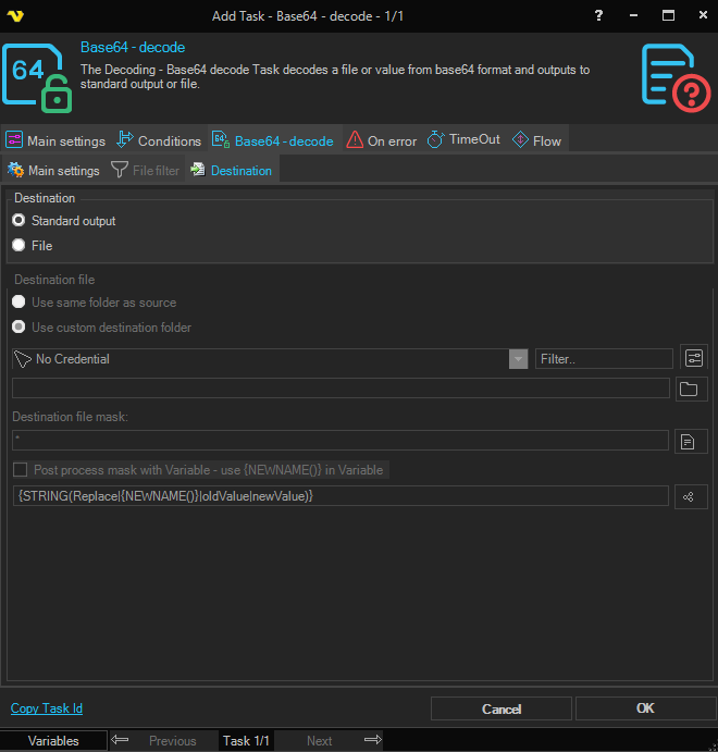Select File if you want to save the decoded content to file or select Standard output to pass the value to the output of the Task.