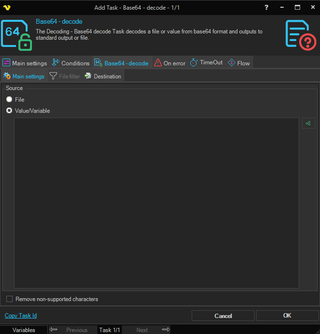 Select File if you want to decode an existing file. When selecting File, the standard VisualCron File filter will be enabled. Select Value/Variable to use an existing value or Variable.