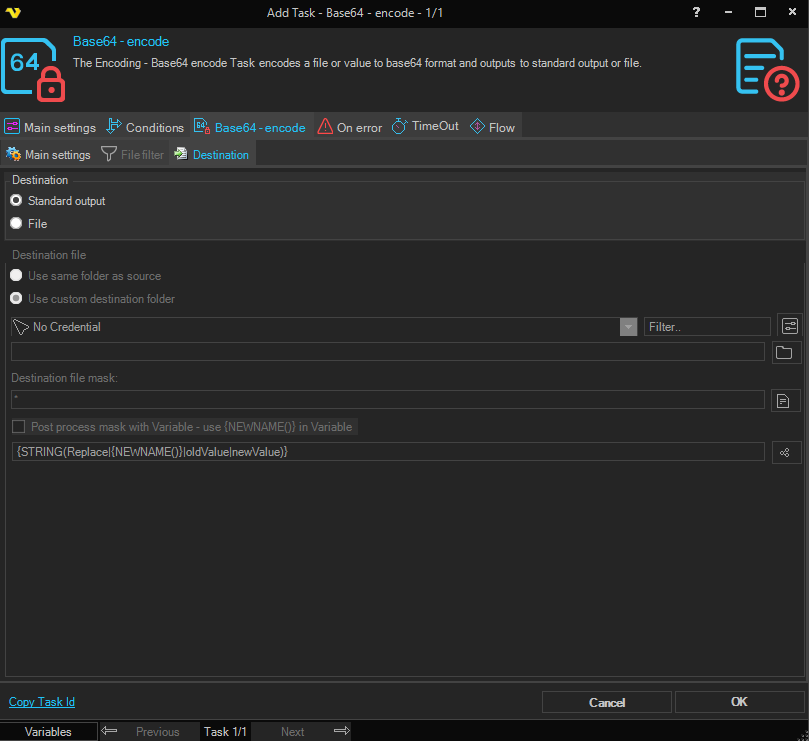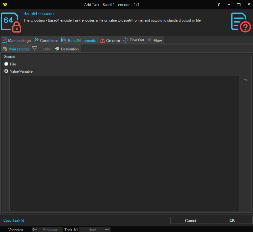 The Encoding - Base 64 encode Task encodes a file or value to Base64 format and outputs to standard output file.