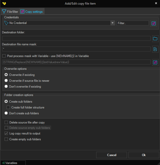 The Copy/Move file(s) Task lets you copy files easily based on file filters. Together with Credentials you are able to to copy/move from/to network drives.