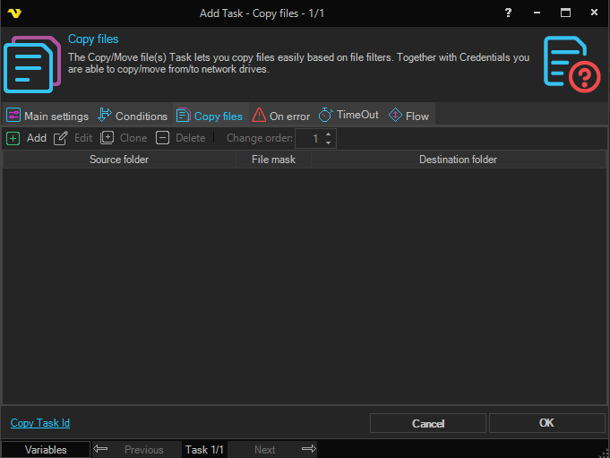 One Copy files Task may contain several copy items. For each copy item a source folder, a file mask and a destination folders is defined.
