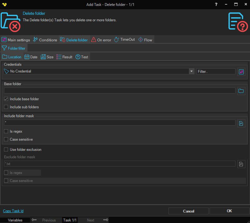 This Task is using the standard VisualCron Folder filter to find one or more folders.