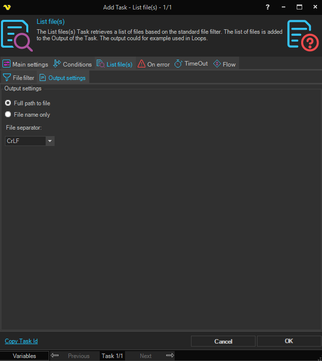 The List files(s) Task retrieves a list of files based on the standard file filter. The list of files is added to the Output of the Task.