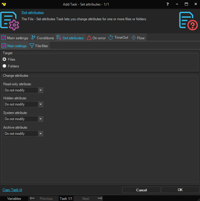 The File - Set attributes Task lets you set attributes for one or more folders or files.