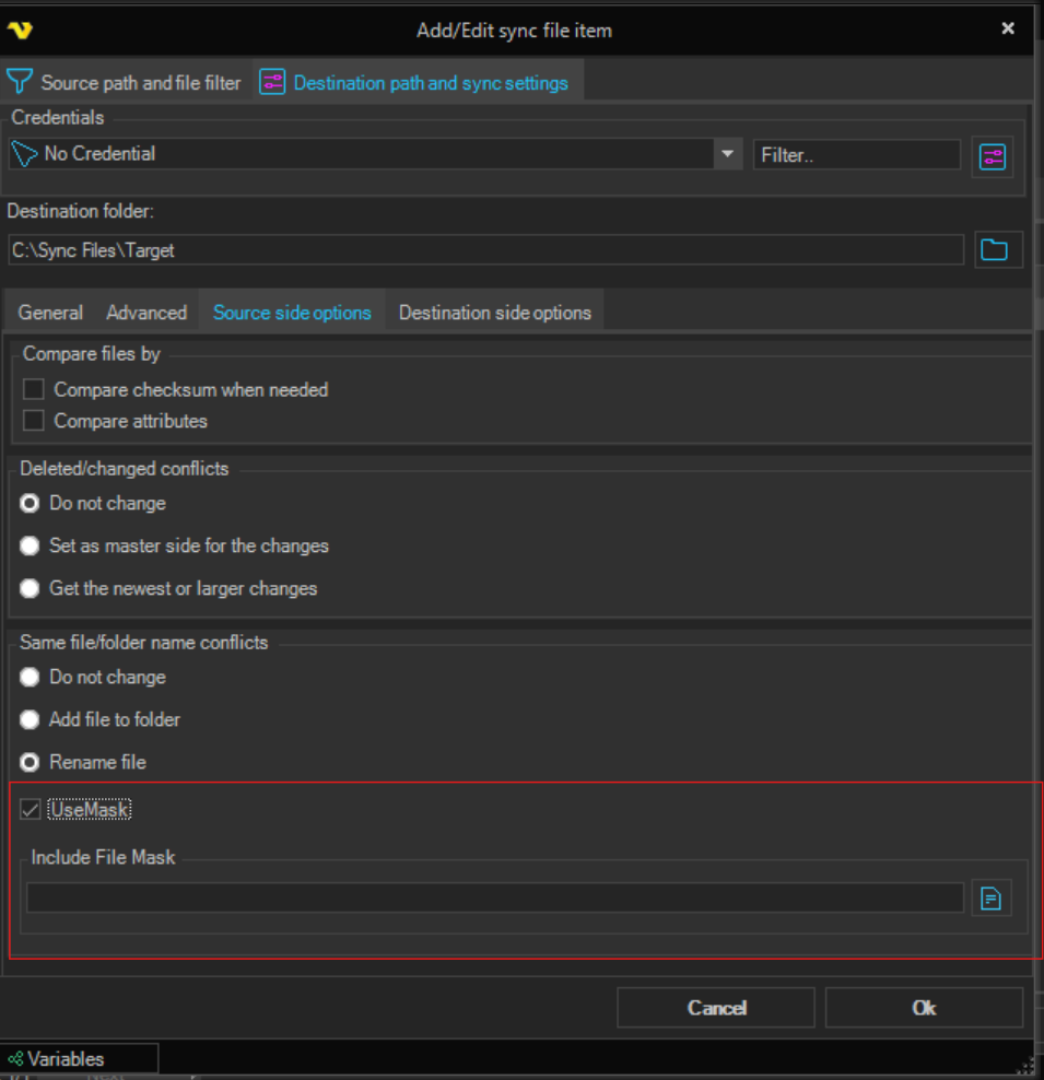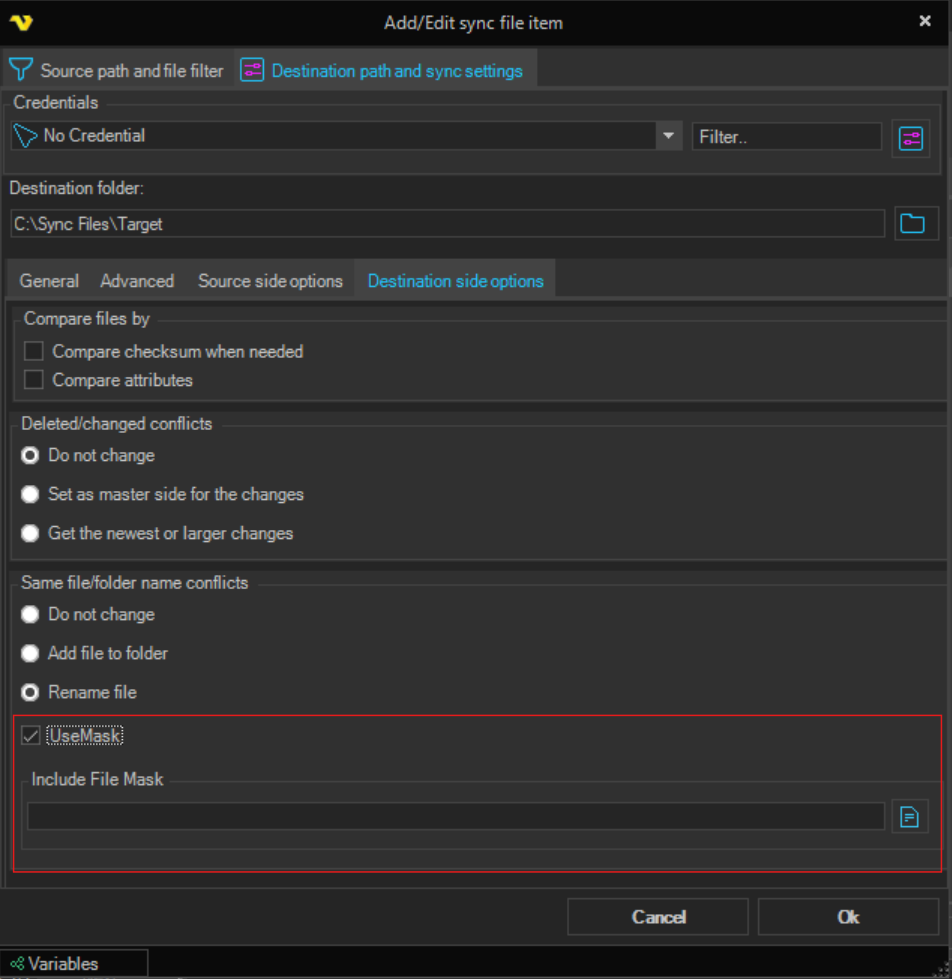 - Custom mask mode: Check UseMask and set an Include File Mask pattern. Custom patterns support variable replacement and preserve file extensions. UseMask and the file mask are stored per sync side (source and destination each have their own settings).