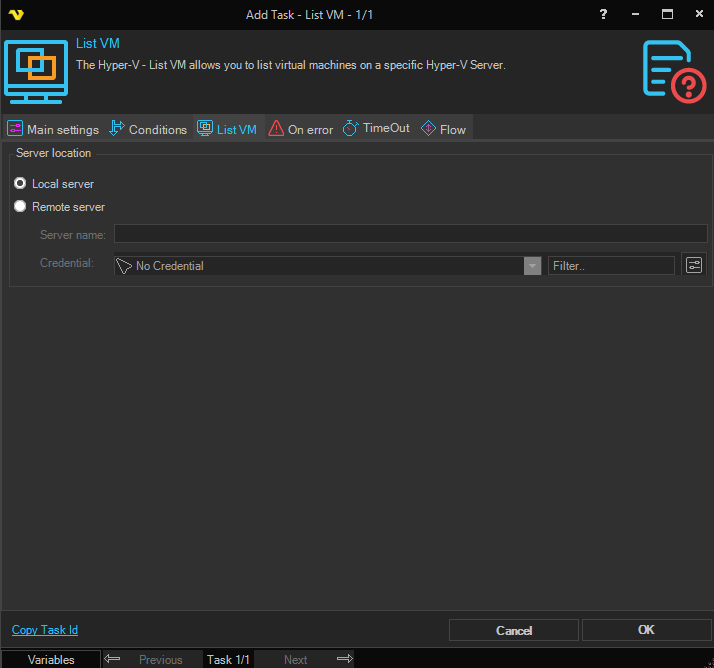 The Hyper-V - List VM Task allows you to list virtual machines hosted on a specific, local or remote, Hyper-V Management Server.