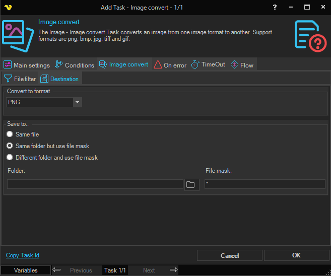 The Image convert Task converts an image from one format to another. Supported formats are png, bmp, jpg, tiff and gif.