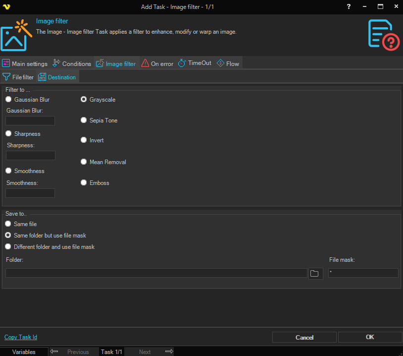 The Image filter Task applies a filter to enhance, modify or warp an image.