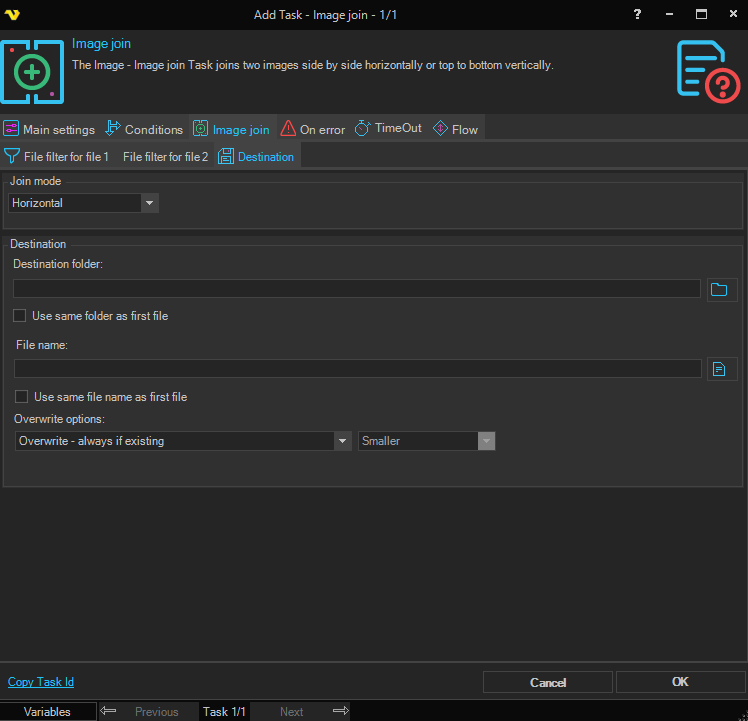 The Image join Task joins two images side by side horizontally or top to bottom vertically.