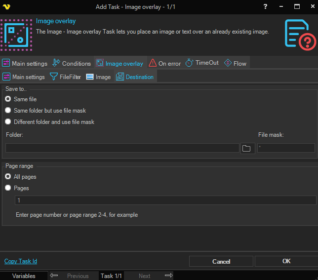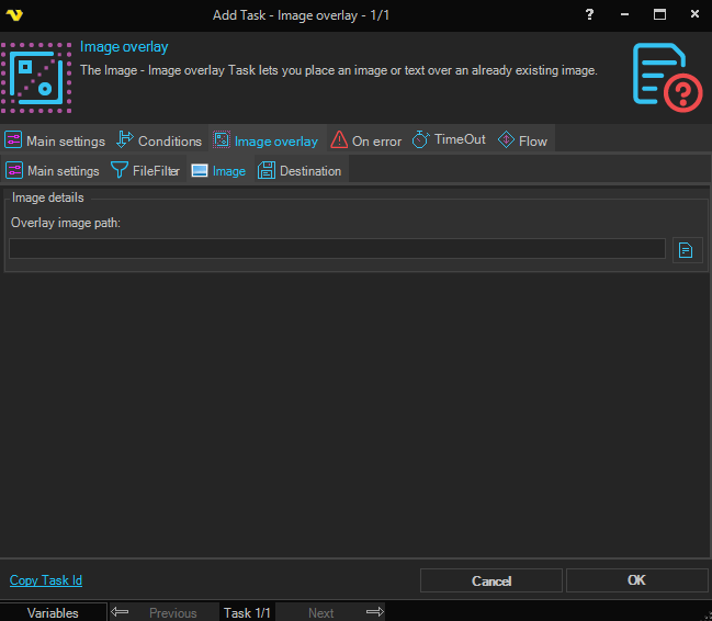 The Image overlay Task lets you place an image or text over an already existing image.