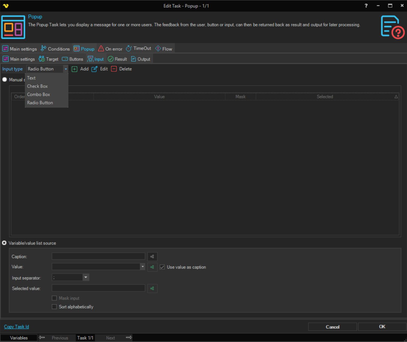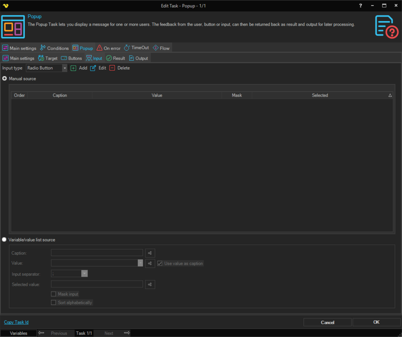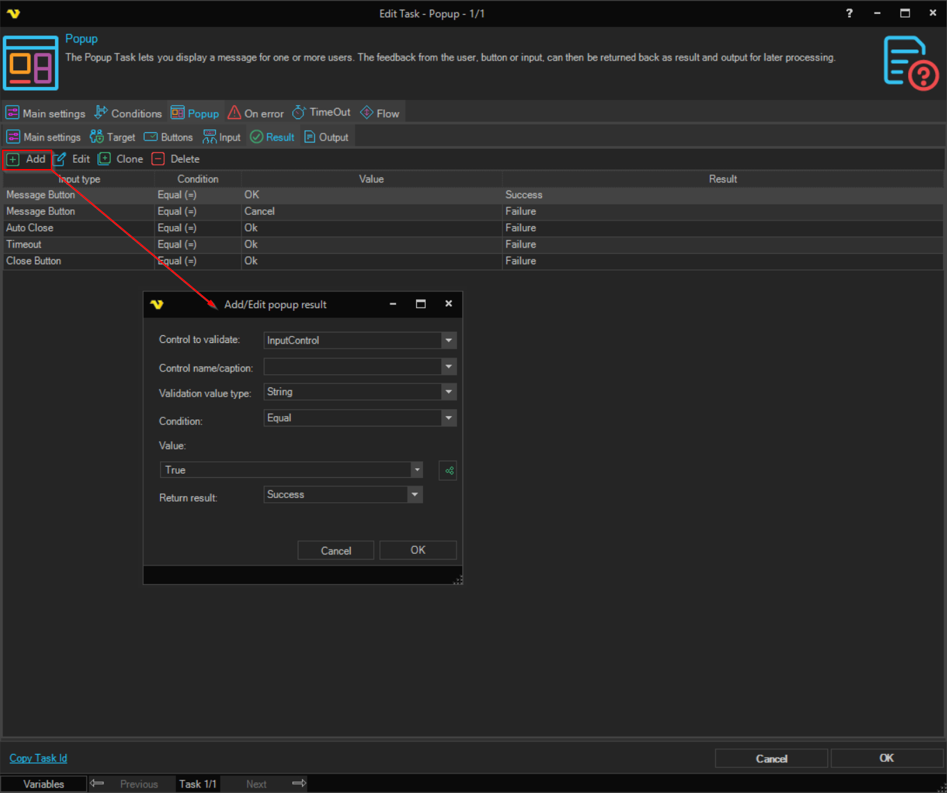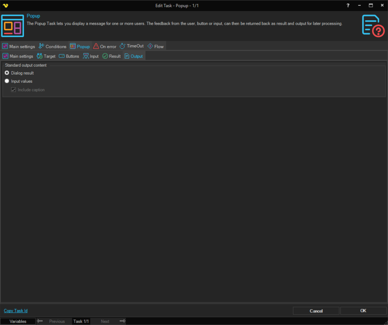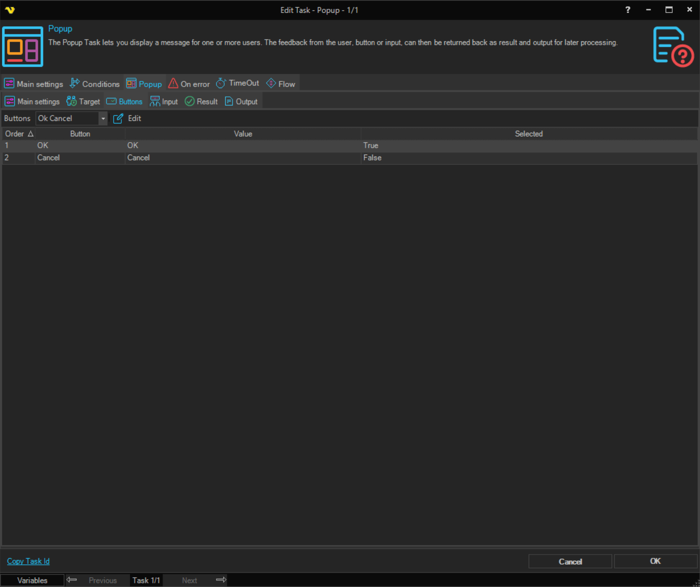 You are able to select among common buttons for the popup. In the Result tab you can control how the press of a specific button affect the result of the Task. In the Output tab you control if the button value should be returned as output or if the Input should be returned.