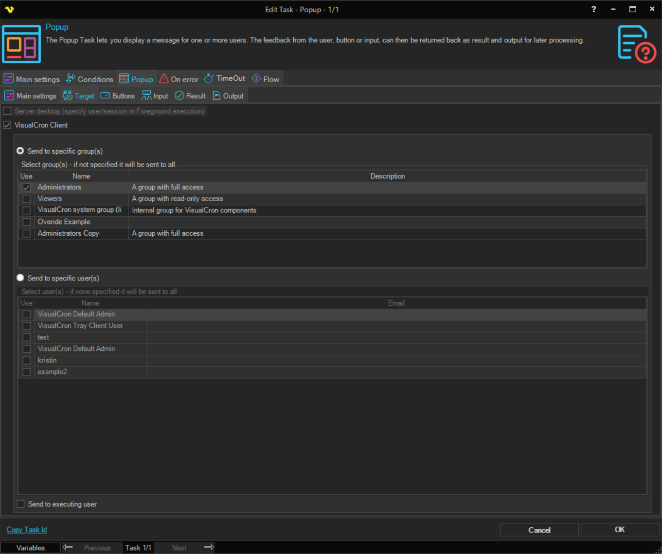 Right now the Popup can be sent to single user(s), specified groups or the user that executes the Task/Job.