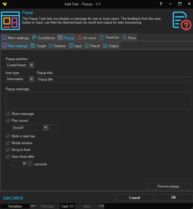 The Popup Task lets you display a message for one or more users. The feedback from the user, button or input, can then be returned back as a result and output for later processing.