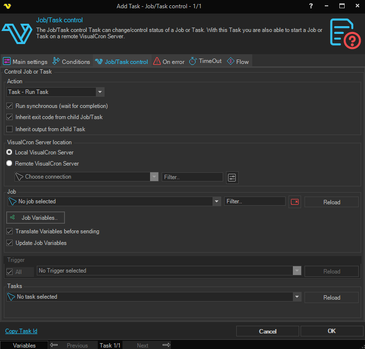 The Job/Task control can change/control status of a Job or Task. With this Task you are also able to start a Job or Task on a remote VisualCron Server.