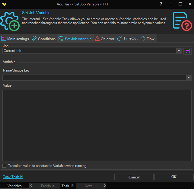 The Set Variable Task allows you to create or update a Variable. Variables can be used and reached throughout the whole application. You can use this to store static or dynamic values.