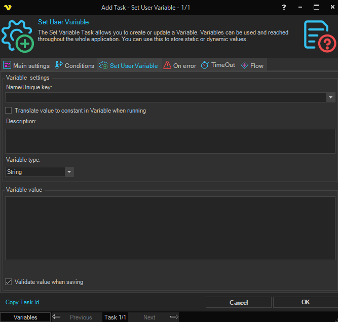 The Set Variable Task allows you to create or update a Variable. Variables can be used and reached throughout the whole application. You can this to store static or dynamic variables.