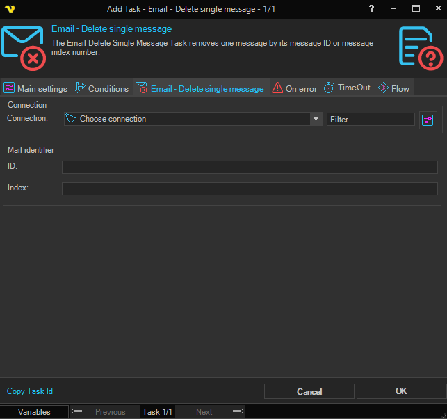 The Email Delete Single Message Task removes one message by its message ID or message index number.