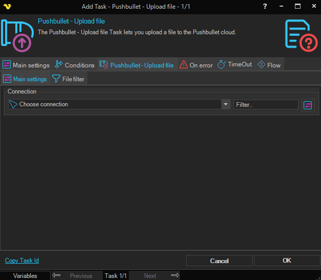 The Pushbullet - Upload file Task allows you to upload one or more files to the Pushbullet cloud repository. This Task will return the URL to the uploaded file.