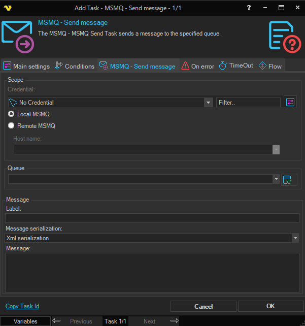 The MSMQ - Send message Task sends a message to the specified queue.